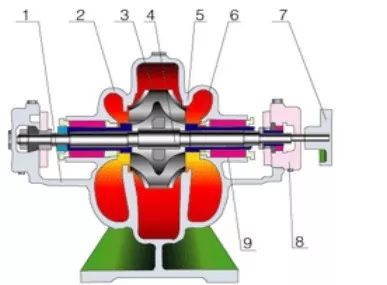 1、 泵體 2、泵蓋 3、葉輪 4、軸 5、雙吸密封環(huán) 6、軸套 7、聯(lián)軸軸器