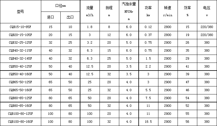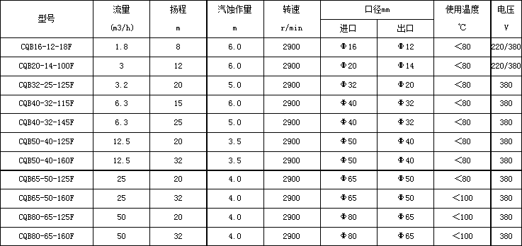 例如:CQB-50-32-160F,其中CQB表示為“磁力泵驅動泵代號”,50表示為“進口口徑mm”,32表示為“出口口徑mm”,160表示為“葉輪直徑mm”,F表示為“氟塑料”。